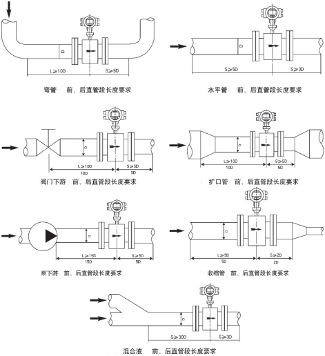 (4)為了安裝、維護(hù)、保養(yǎng)方便,在流量計(jì)周圍需有充裕的安裝空間。