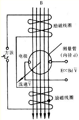 此時,如果具有一定電導率的流體流經(jīng)測量管,將切割磁力線感應(yīng) 出電動勢 E。電動勢 E 正比于磁通量密度 B、測量管內(nèi)徑 d 與平均流速 V 的乘積,電動勢 E(流量信號)由電極檢出并通過電纜送至轉(zhuǎn)換器。