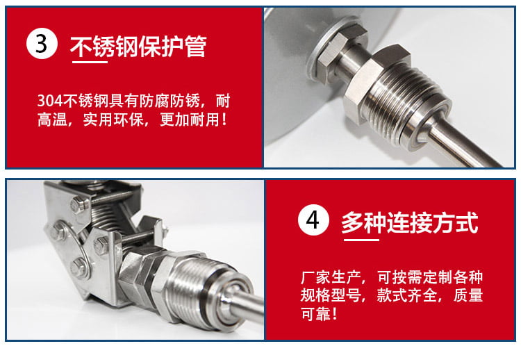 3、保護管浸入被測介質(zhì)中長度必須大于感溫元件的長度,一般浸入長度建議大于100mm,0-50℃量程的浸入長度建議大于150mm,以保證測量的準(zhǔn)確性。