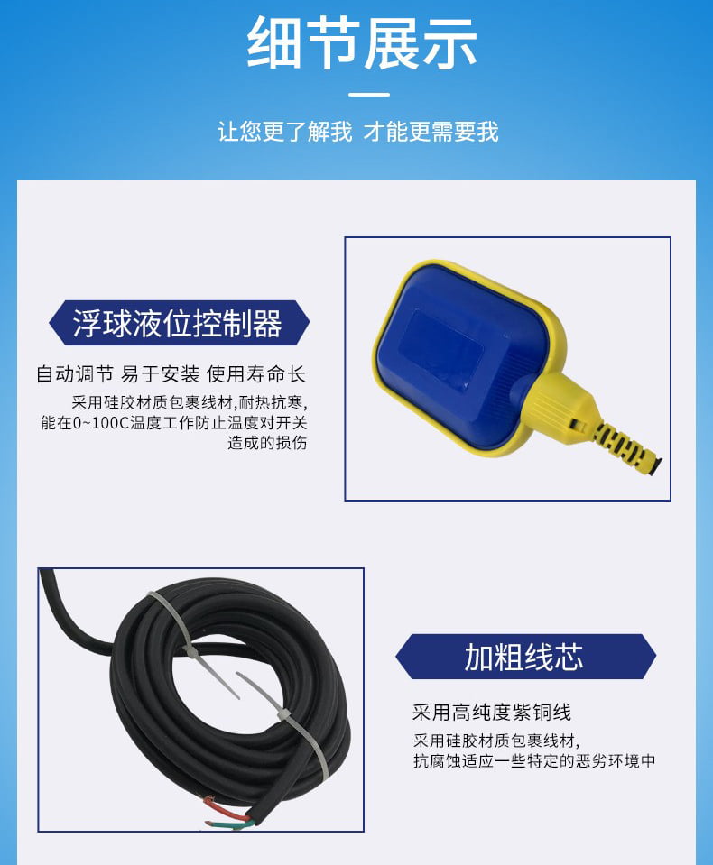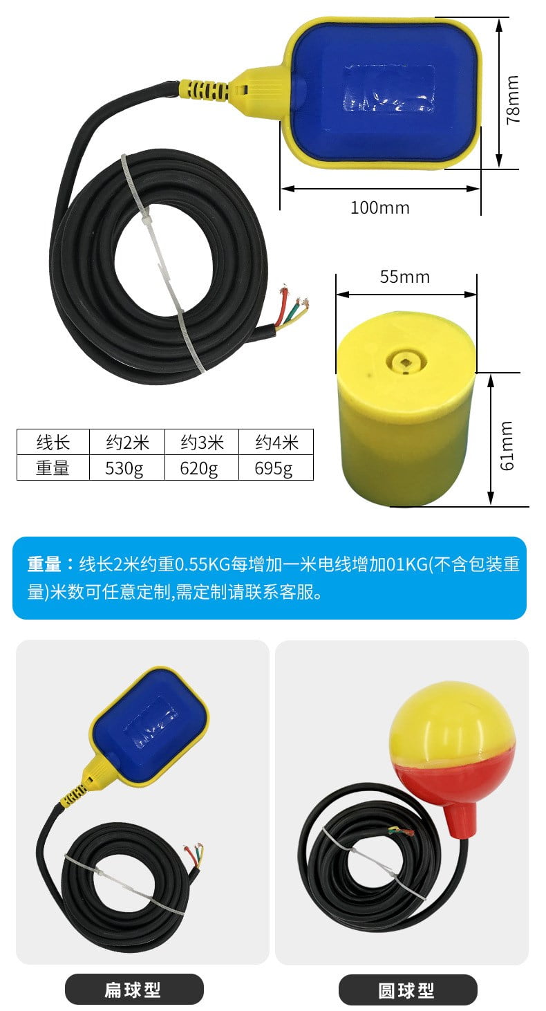 電纜浮球液位控制器是利用塑膠射出一體成型,所以結構堅固,性能穩(wěn)定可靠,同時無毒、耐腐蝕,安裝方便,價格低廉,對長距離多點控制、沉水泵、有波動的液體或有雜質的液體控制效果佳。一般液體亦可使用。電纜線長度任何長度皆可定制。電纜浮球開關為金屬,接點零件為水銀開關,其特點為耐高溫,電纜線采用高柔性電纜,經(jīng)久耐用。由于其簡單可靠,經(jīng)濟方便的特點,使其**運用于各種大型容器的液位控制,尤其在市政給排水、消防、水處理等行業(yè)。