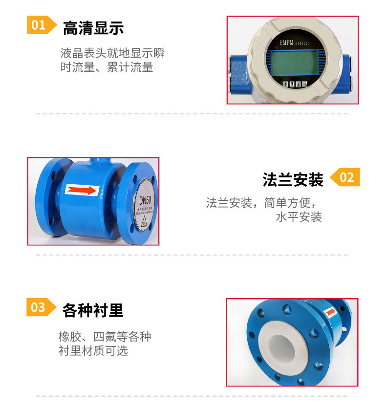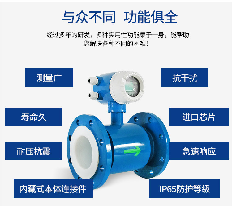 智能型電磁流量計(jì)采用**技術(shù)。利用恒流低頻三值矩形波或雙頻矩形波勵(lì)磁,既有矩形波磁場的優(yōu)點(diǎn),又克服了正弦波 磁場的缺點(diǎn);還可以消除電源電壓波動、電源頻率變化及勵(lì)磁線圈阻抗變化所造成的誤差;并有極好的零點(diǎn)穩(wěn)定性和不受流體噪聲干擾影響。從而具有高穩(wěn)定性、高可靠性的特點(diǎn)。電磁流量計(jì)由傳感器和轉(zhuǎn)換器組成,傳感器安裝在測量管道上,轉(zhuǎn)換器可以與傳感器組合連接在一起稱為一體型電磁流量計(jì),轉(zhuǎn)換器被安裝在離傳感器30米內(nèi)或100米內(nèi)的場合,兩者間由屏蔽電纜連接稱為分離型電磁流計(jì)。電磁流量計(jì)傳感器主要組成部分是:測量管、電極、勵(lì)磁線圈、鐵芯與磁軛殼體。
